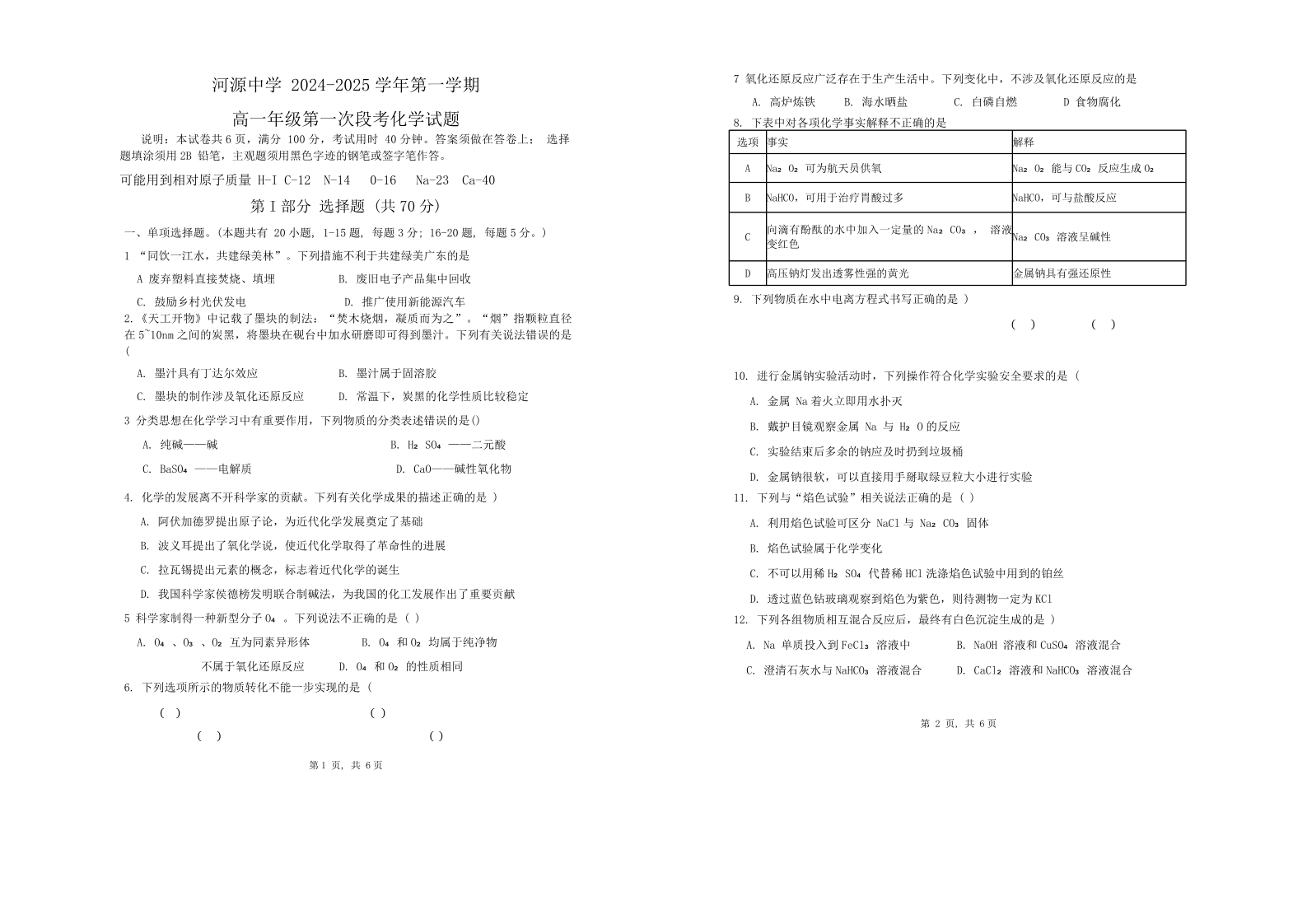 河源中学2024-2025学年第一学期高一年级第一次段考 化学