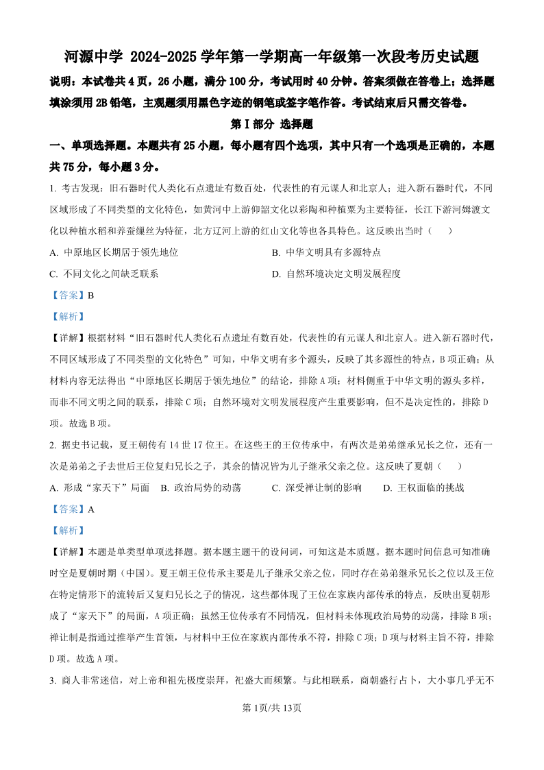 河源中学2024-2025学年第一学期高一年级第一次段考 历史答案