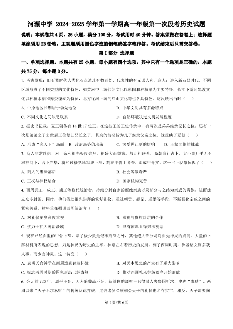 河源中学2024-2025学年第一学期高一年级第一次段考 历史