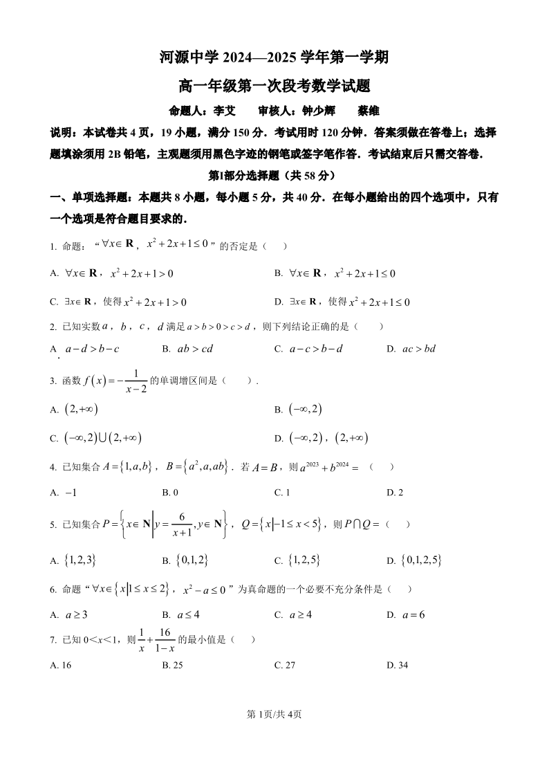 河源中学2024-2025学年第一学期高一年级第一次段考 数学