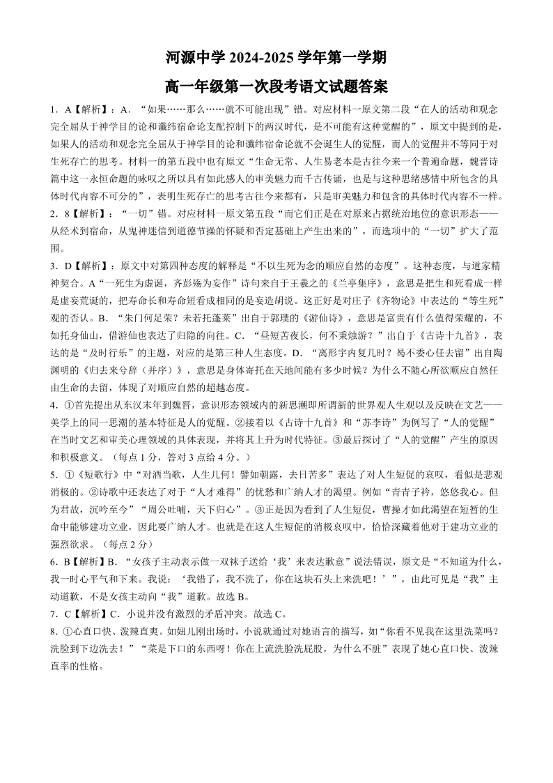 河源中学2024-2025学年第一学期高一年级第一次段考 语文答案