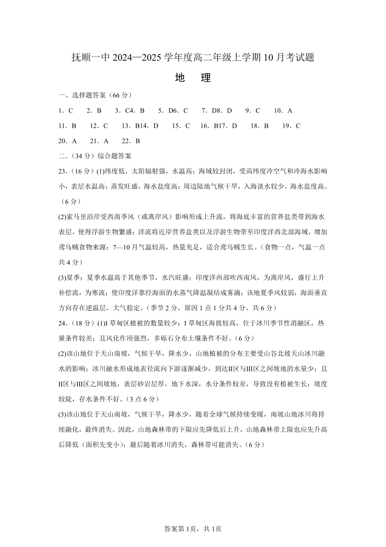 抚顺一中2024-2025学年度高二年级10月月考 地理答案