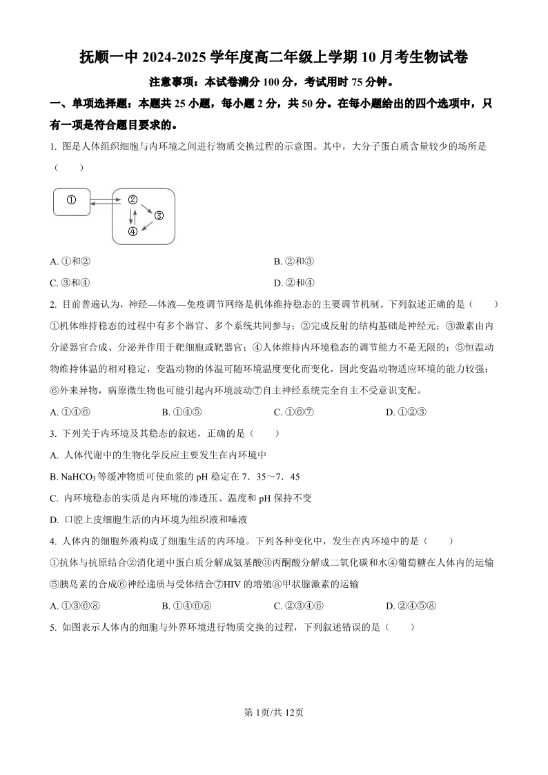 抚顺一中2024-2025学年度高二年级10月月考 生物