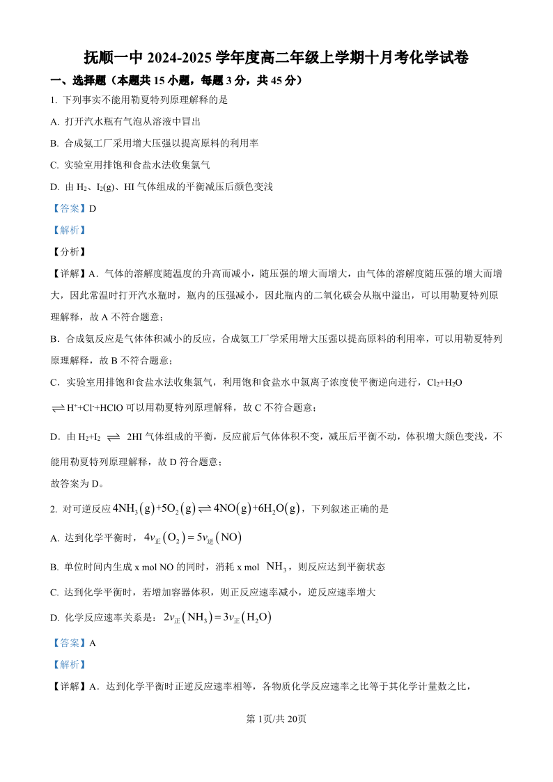 抚顺一中2024-2025学年度高二年级10月月考 化学答案
