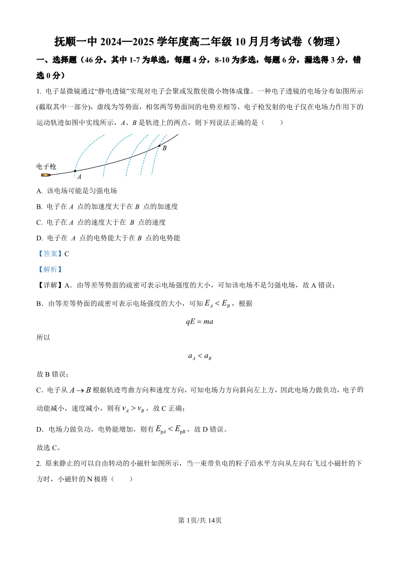 抚顺一中2024-2025学年度高二年级10月月考 物理答案