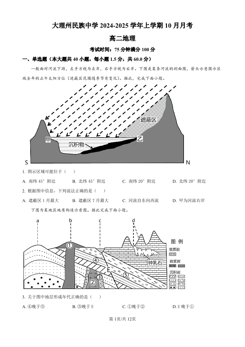 大理州民族中学2024-2025学年高二年级10月月考 地理