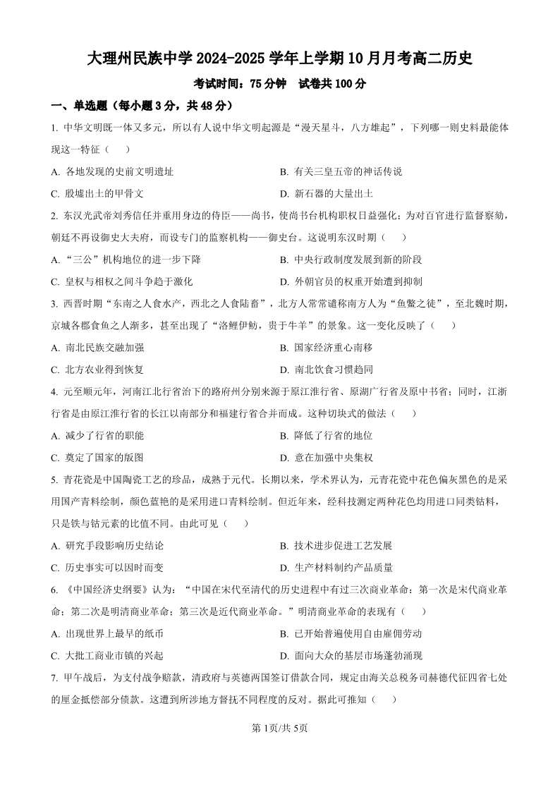 大理州民族中学2024-2025学年高二年级10月月考 历史