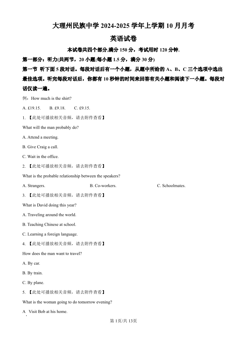 大理州民族中学2024-2025学年高二年级10月月考 英语
