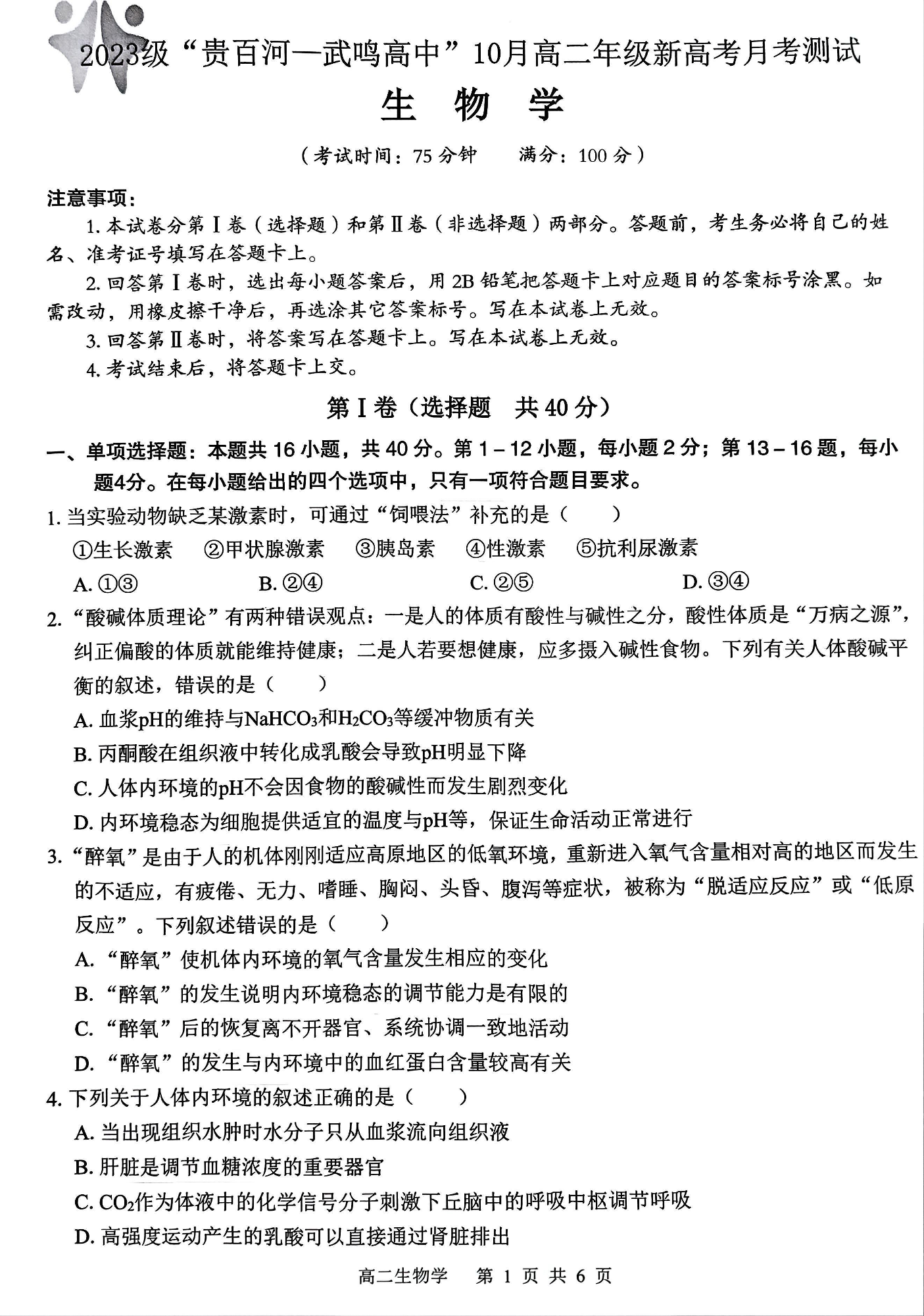 广西2023级“贵百河-武鸣高中”10月高二年级新高考月考测试 生物