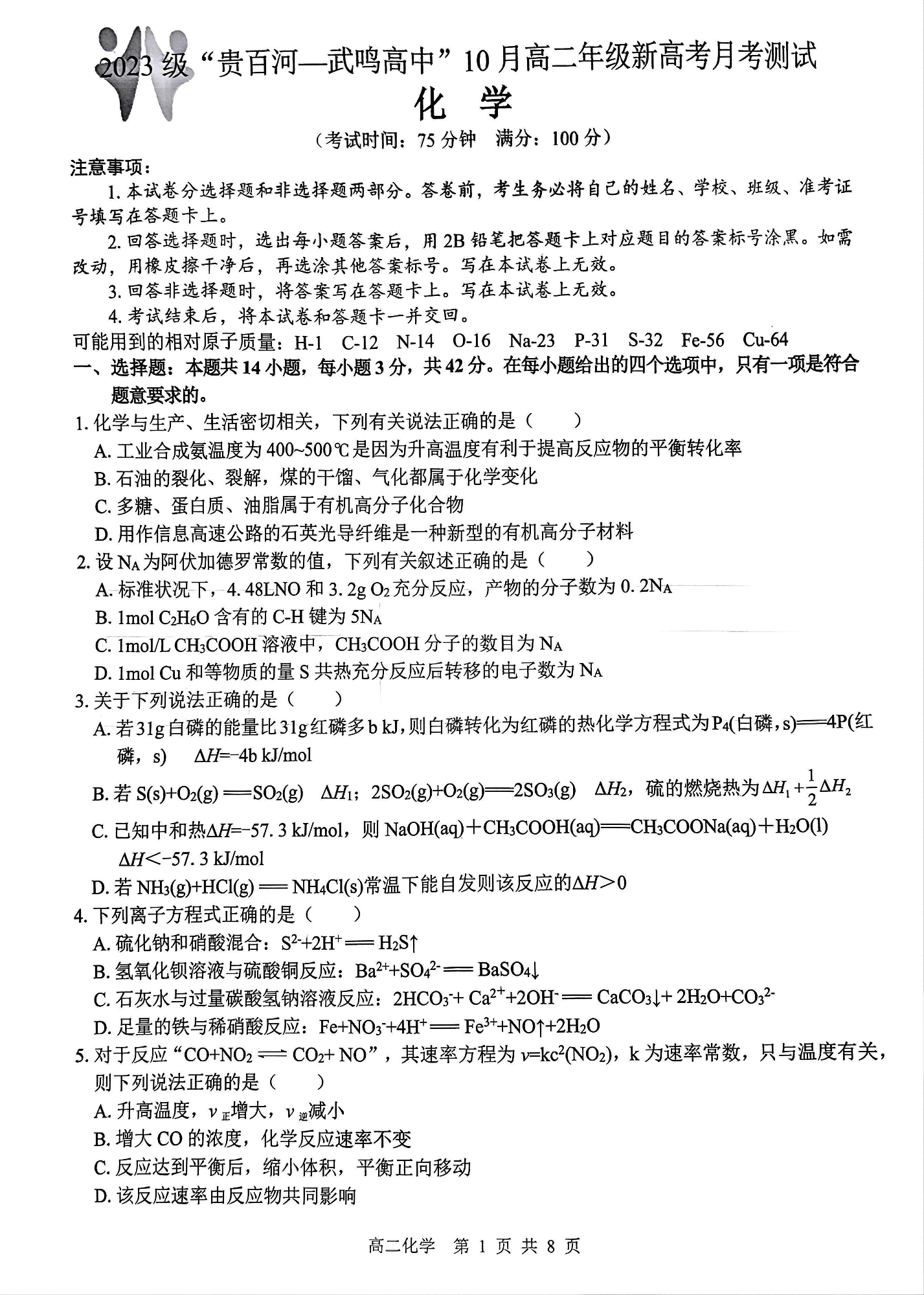 广西2023级“贵百河-武鸣高中”10月高二年级新高考月考测试 化学