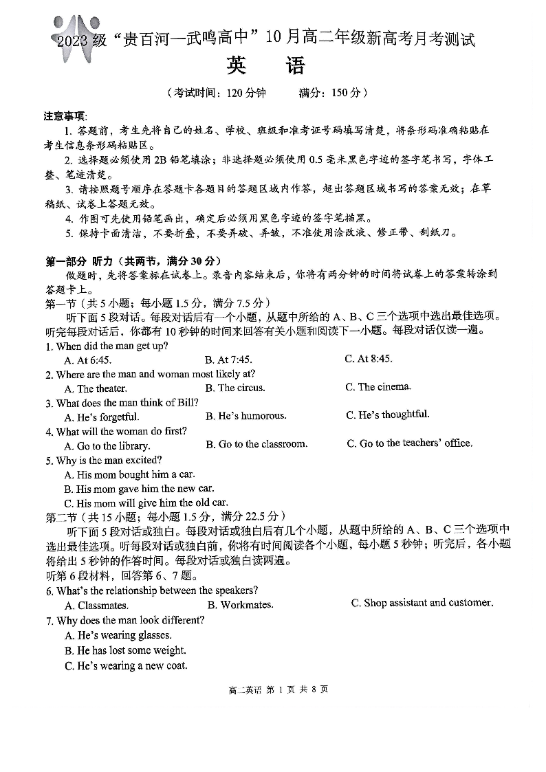 广西2023级“贵百河-武鸣高中”10月高二年级新高考月考测试 英语