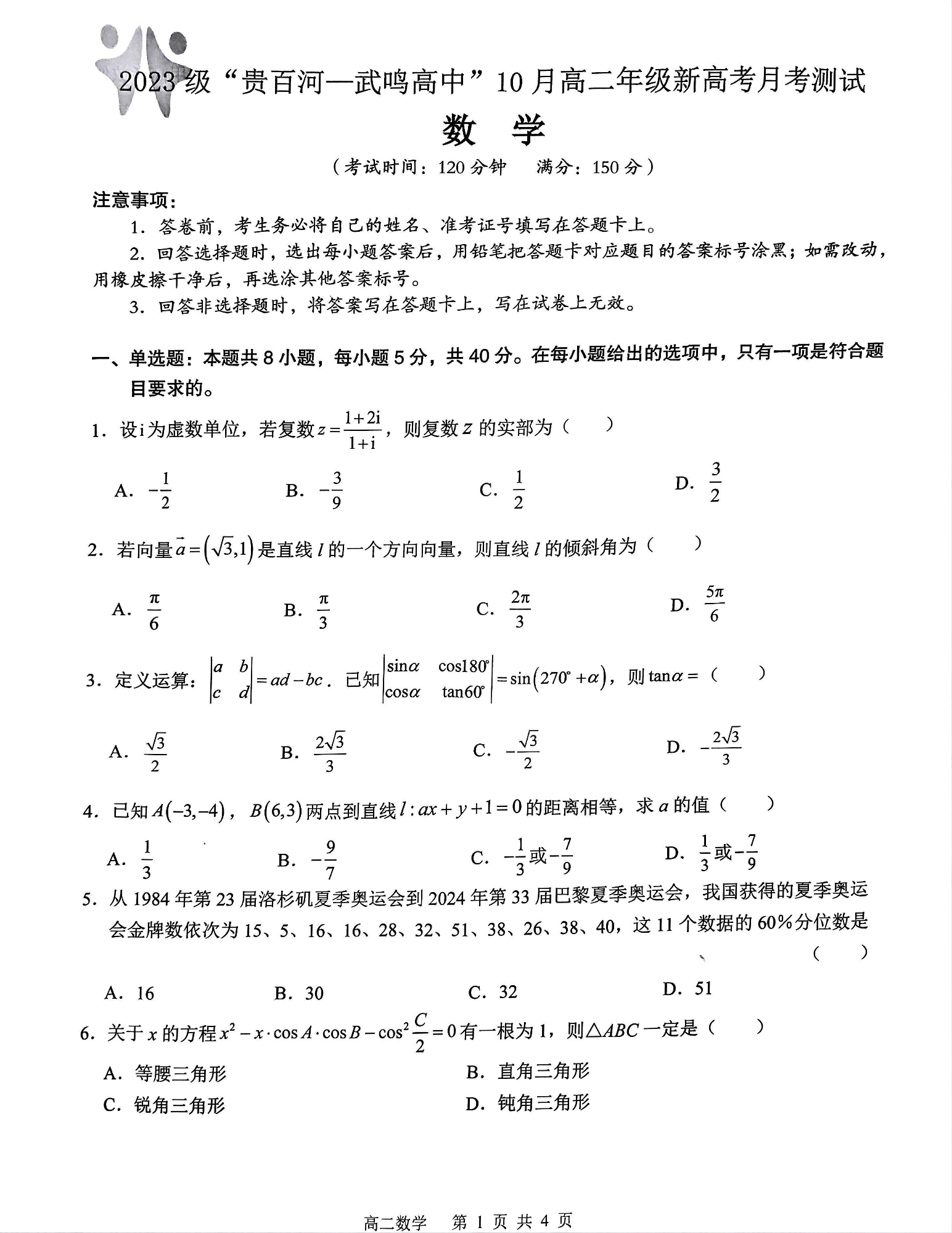 广西2023级“贵百河-武鸣高中”10月高二年级新高考月考测试 数学