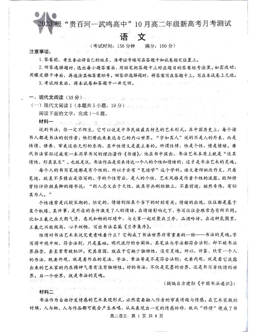 广西2023级“贵百河-武鸣高中”10月高二年级新高考月考测试 语文