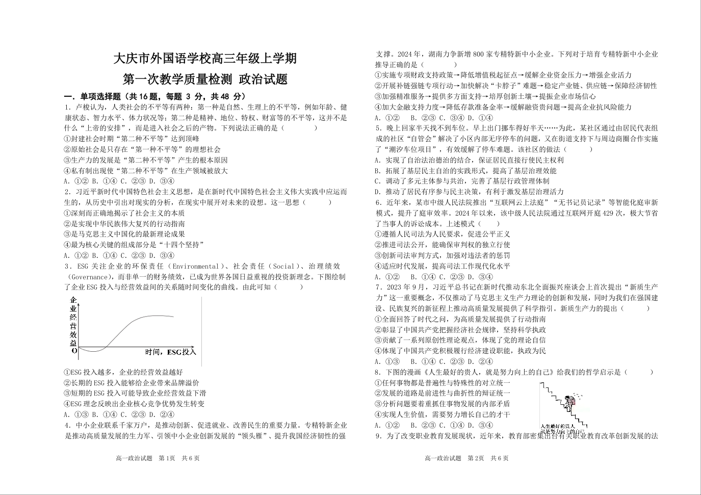黑龙江省大庆外国语学校2024-2025学年高三上学期第一次教学质量检测 政治