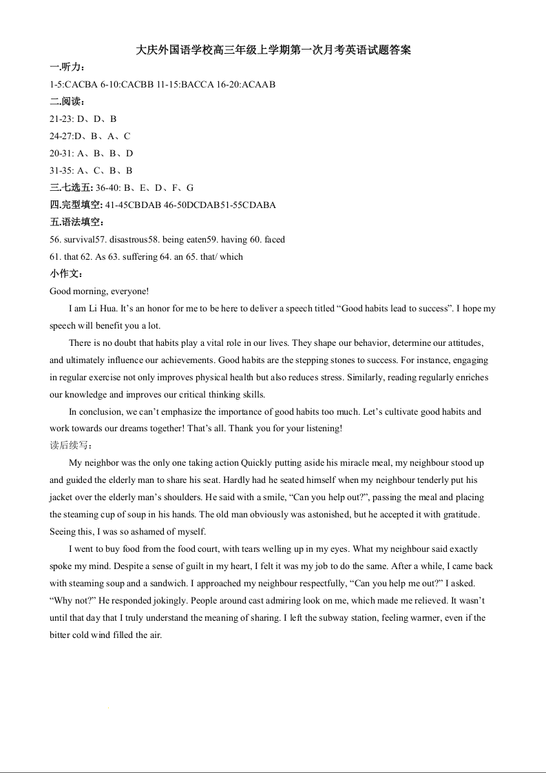 黑龙江省大庆外国语学校2024-2025学年高三上学期第一次教学质量检测 英语答案