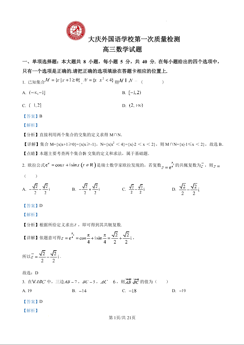 黑龙江省大庆外国语学校2024-2025学年高三上学期第一次教学质量检测 数学答案