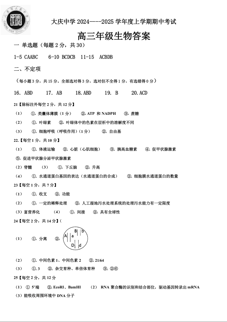 黑龙江省大庆市大庆中学2025届高三上学期10月期中考试 生物答案