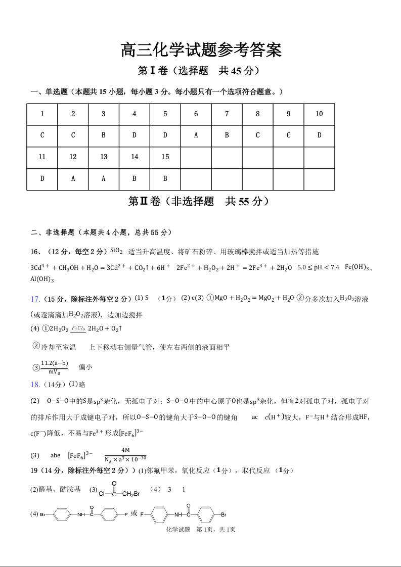 黑龙江省大庆市大庆中学2025届高三上学期10月期中考试 化学答案