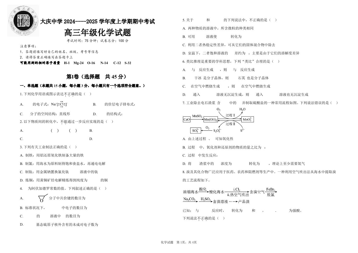 黑龙江省大庆市大庆中学2025届高三上学期10月期中考试 化学