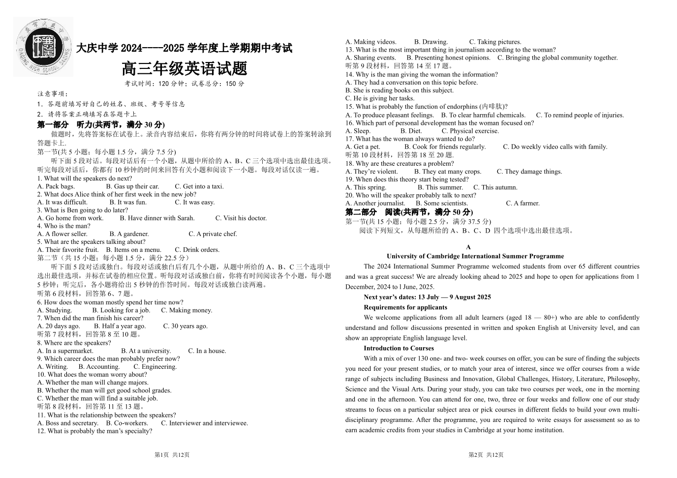 黑龙江省大庆市大庆中学2025届高三上学期10月期中考试 英语