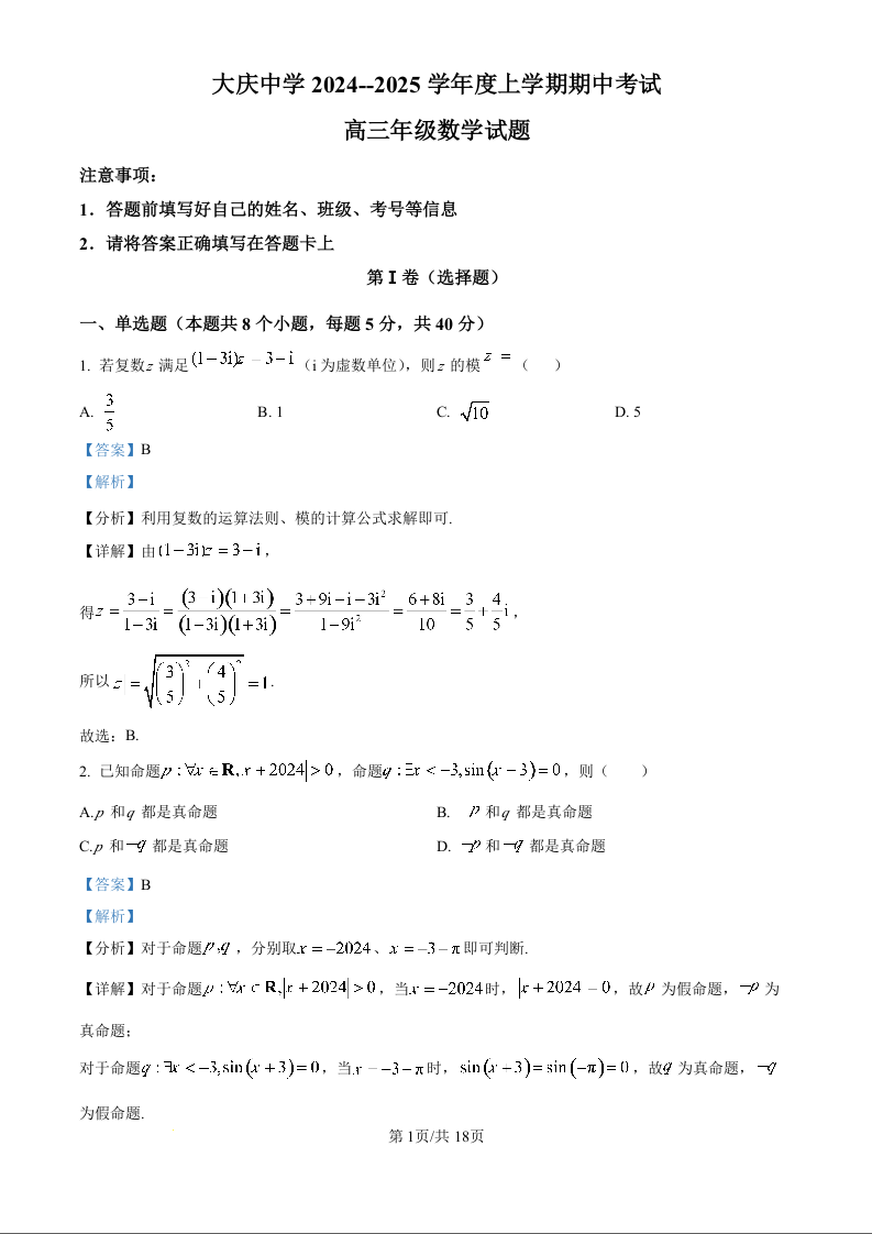 黑龙江省大庆市大庆中学2025届高三上学期10月期中考试 数学答案