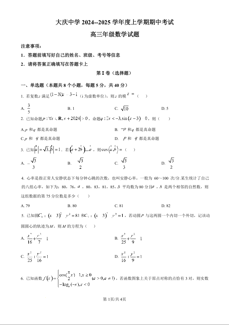 黑龙江省大庆市大庆中学2025届高三上学期10月期中考试 数学