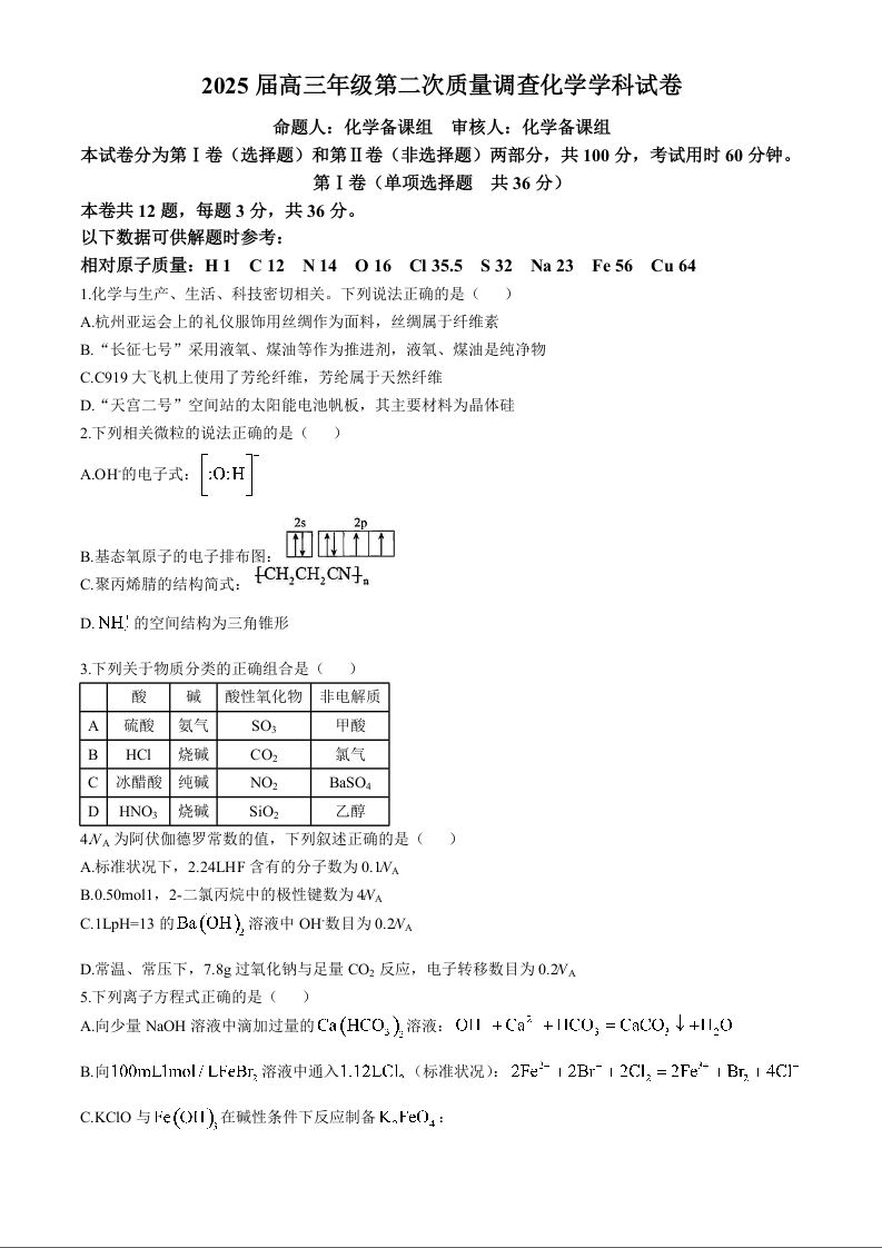 天津市实验中学2024-205学年高三上学期第二次月考 化学