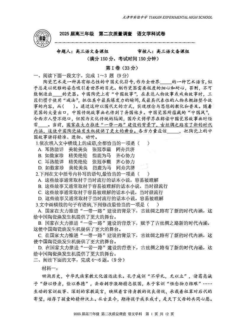 天津市实验中学2024-205学年高三上学期第二次月考 语文
