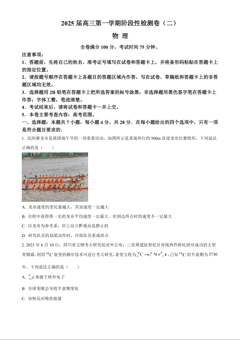 陕西省新高考联盟2024-2025学年高三上学期阶段性检测(二) 物理