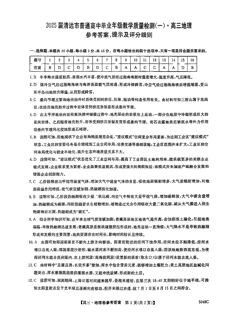 广东省清远市2024-2025学年高三上学期第一次模拟考试 地理答案