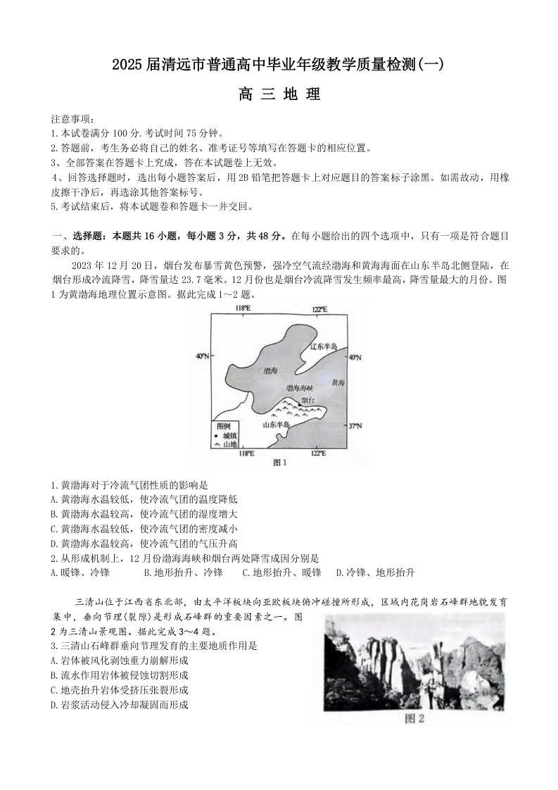 广东省清远市2024-2025学年高三上学期第一次模拟考试 地理