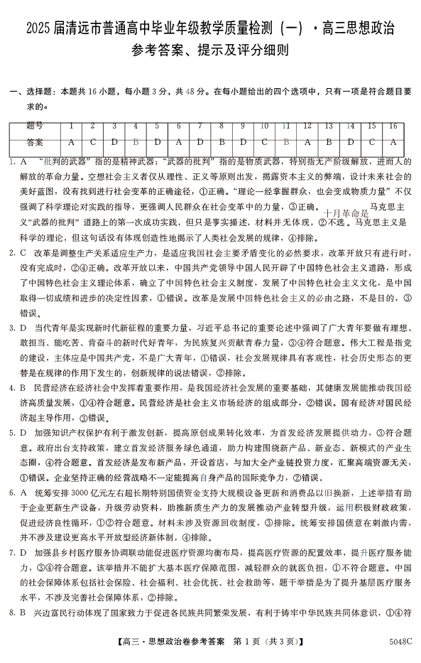 广东省清远市2024-2025学年高三上学期第一次模拟考试 政治答案