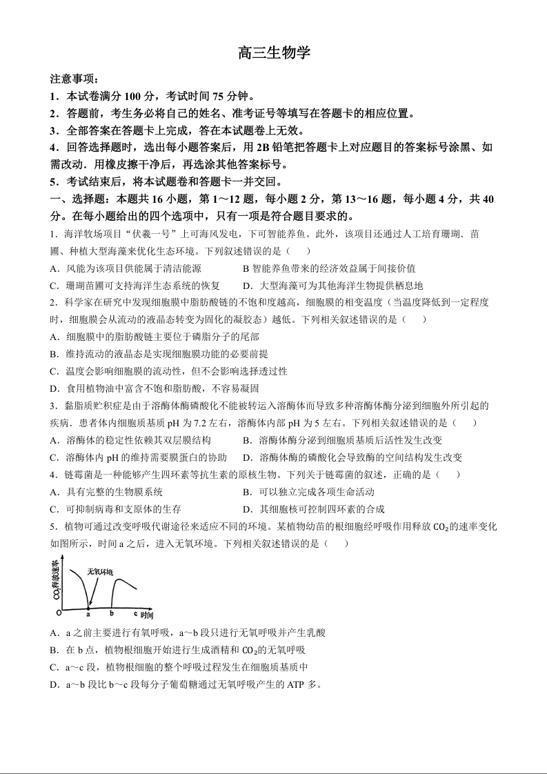 广东省清远市2024-2025学年高三上学期第一次模拟考试 生物