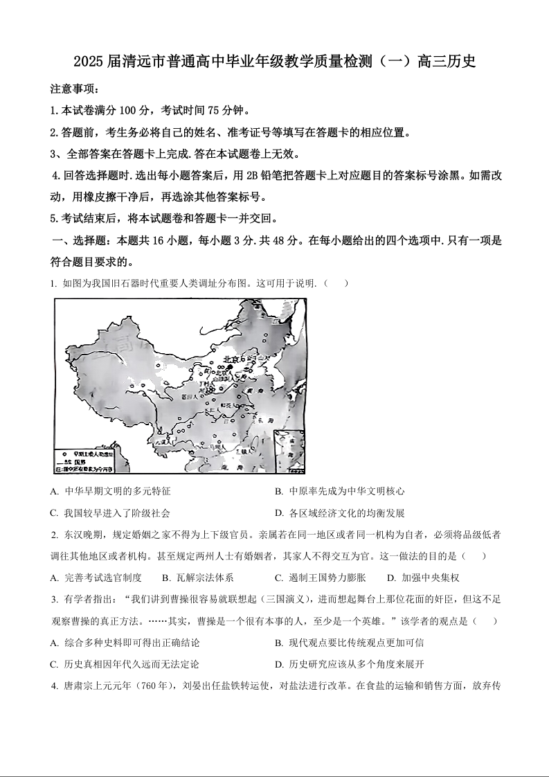 广东省清远市2024-2025学年高三上学期第一次模拟考试 历史