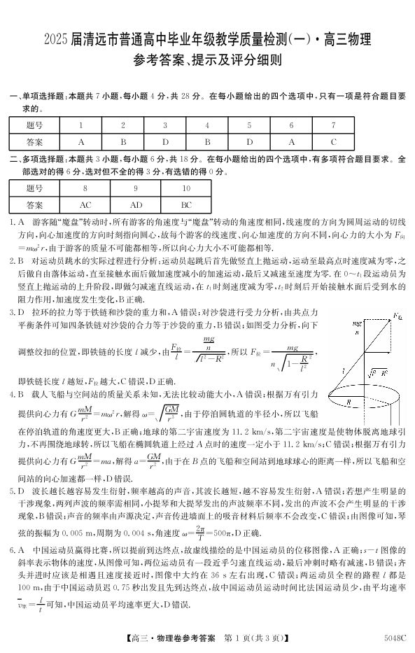 广东省清远市2024-2025学年高三上学期第一次模拟考试 物理答案