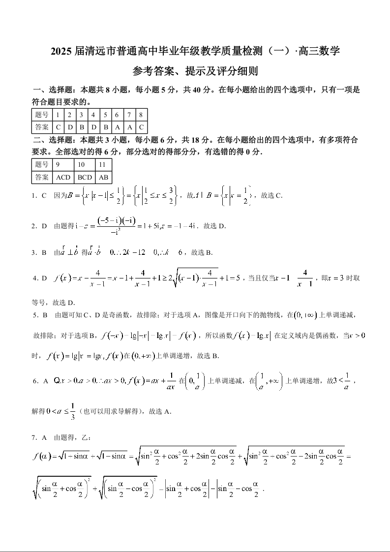 广东省清远市2024-2025学年高三上学期第一次模拟考试 数学答案