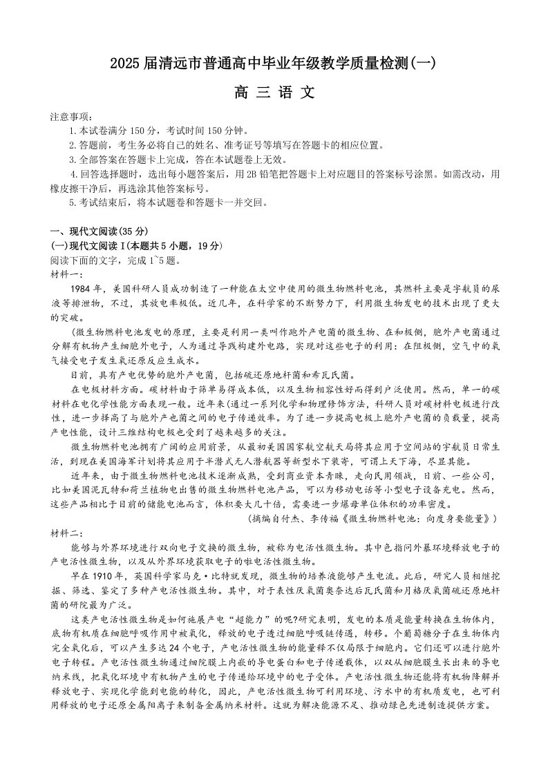 广东省清远市2024-2025学年高三上学期第一次模拟考试 语文