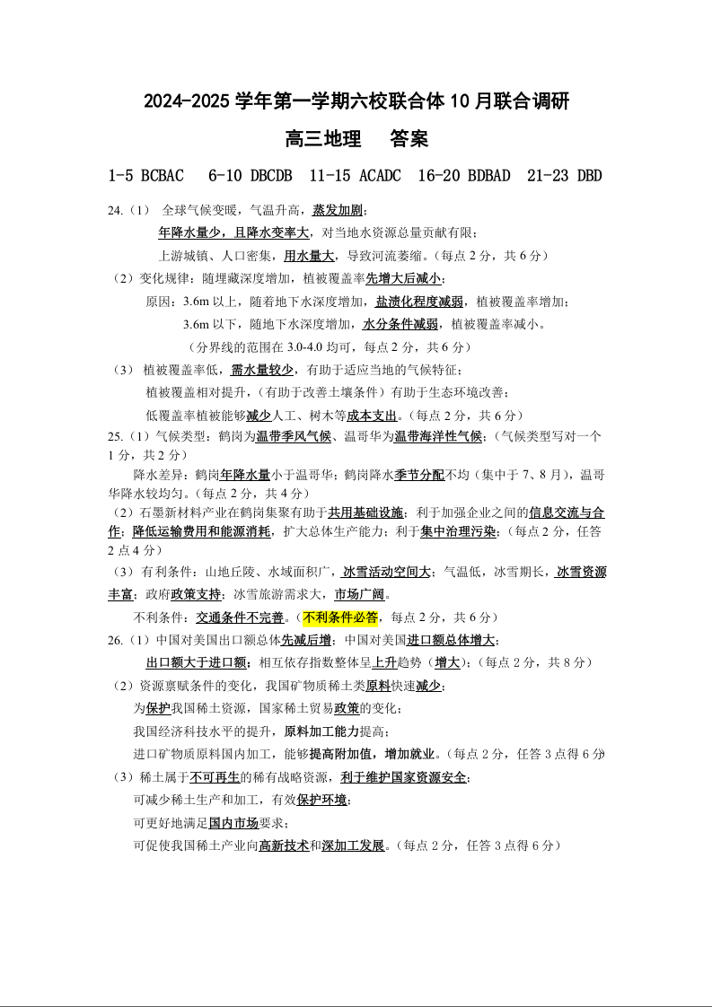 2024-2025学年第一学期六校联合体10月联合调研 地理答案