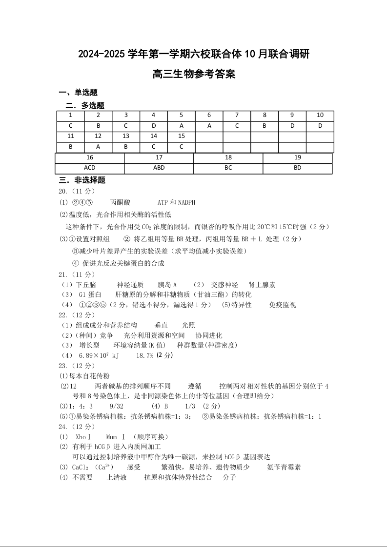 2024-2025学年第一学期六校联合体10月联合调研 生物答案