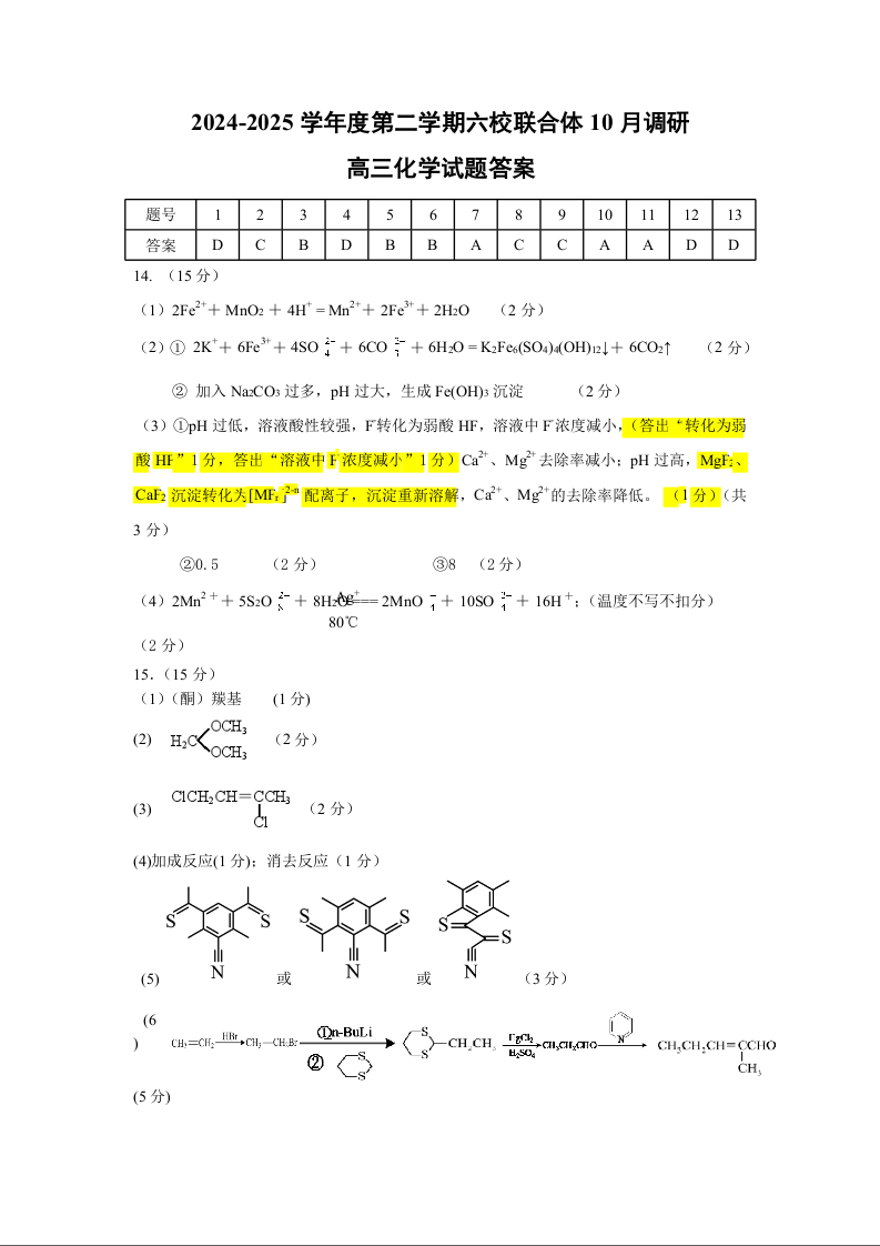 2024-2025学年第一学期六校联合体10月联合调研 化学答案