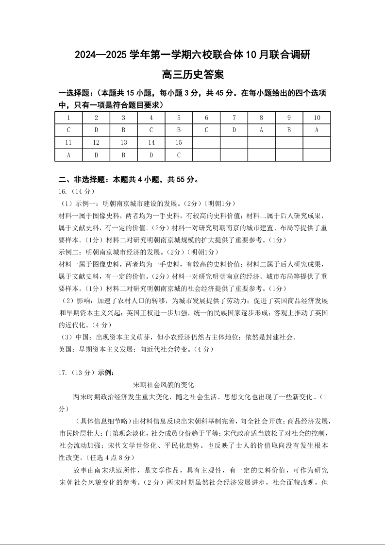 2024-2025学年第一学期六校联合体10月联合调研 历史答案