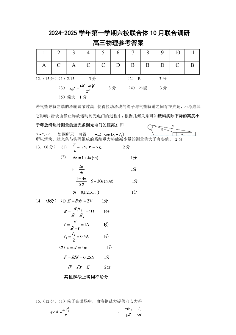 2024-2025学年第一学期六校联合体10月联合调研 物理答案