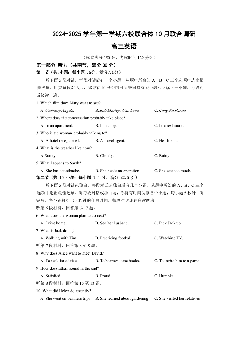 2024-2025学年第一学期六校联合体10月联合调研 英语