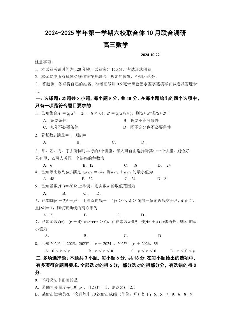 2024-2025学年第一学期六校联合体10月联合调研 数学