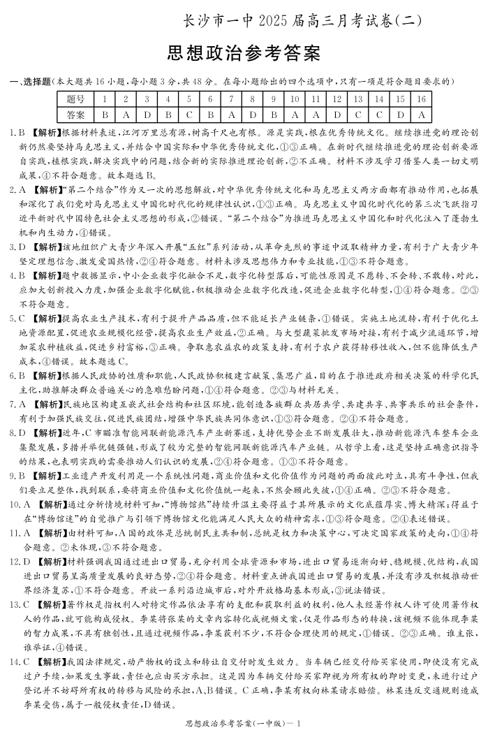 长沙市一中2025届高三月考试卷(二)政治答案