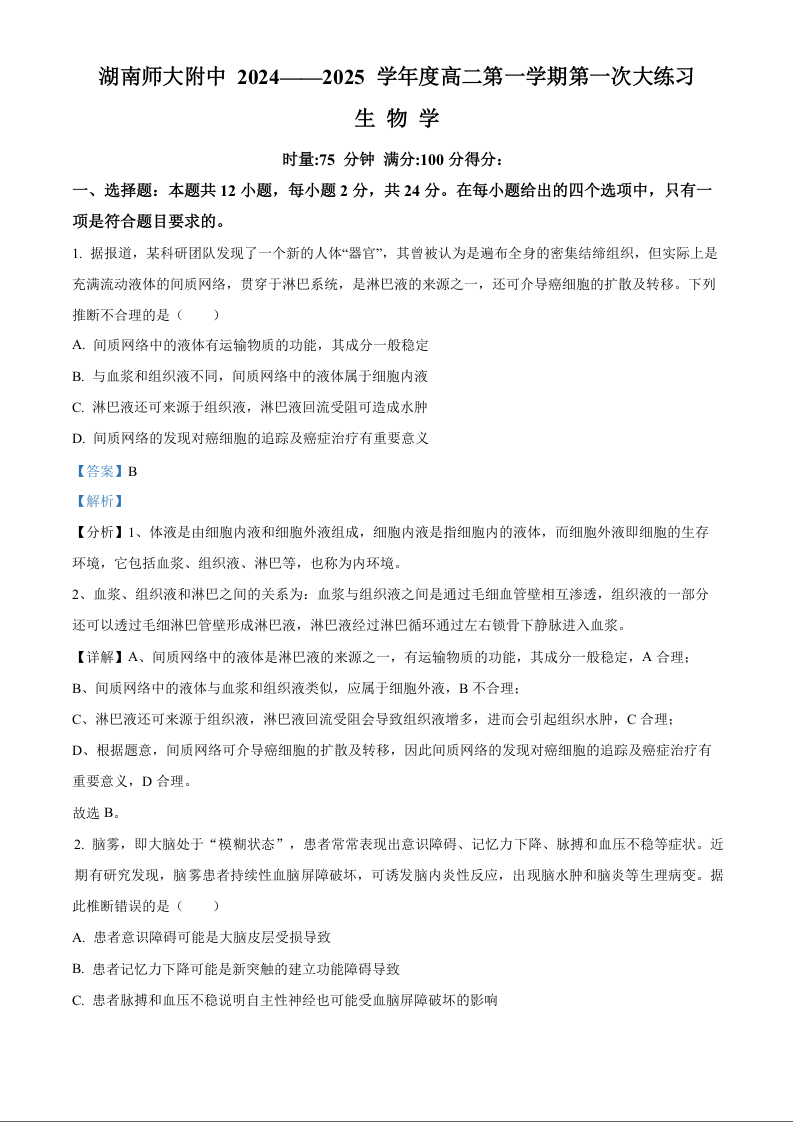 湖南师大附中2024—2025学年度高二第一学期第一次大练习 生物答案