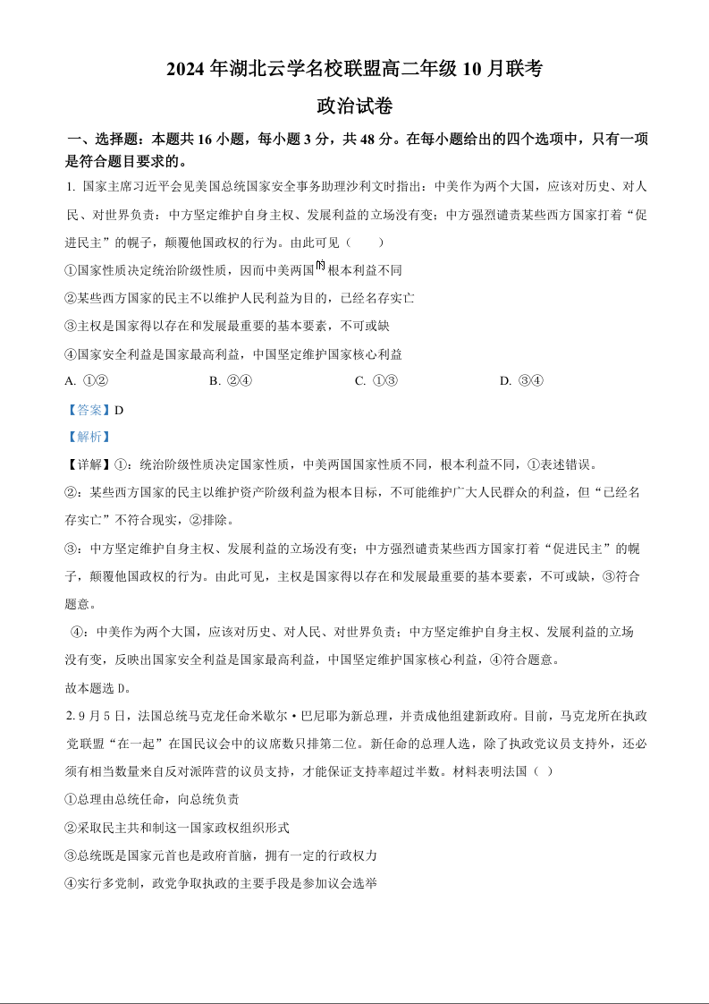 2024年湖北云学名校联盟高二年级10月联考 政治答案