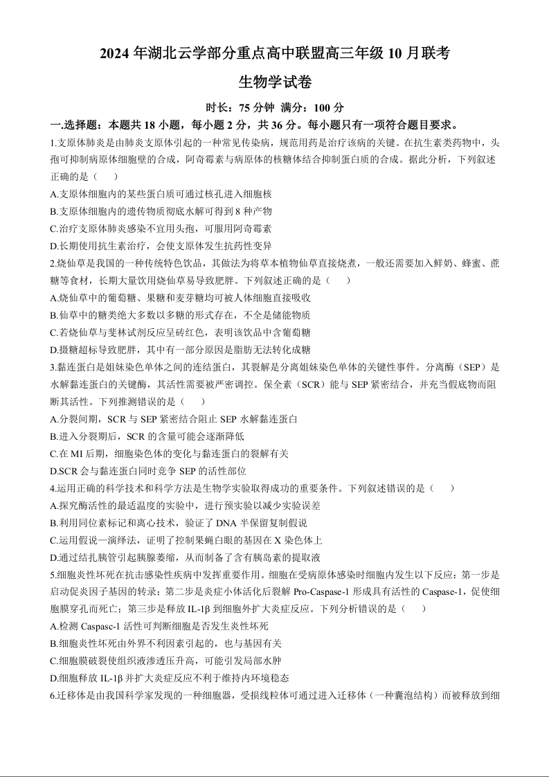 2024年湖北云学名校联盟高二年级10月联考 生物