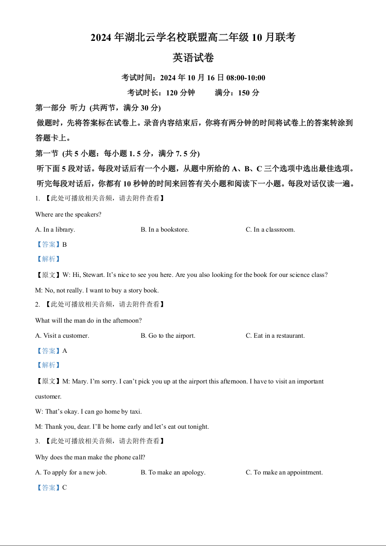 2024年湖北云学名校联盟高二年级10月联考 英语答案