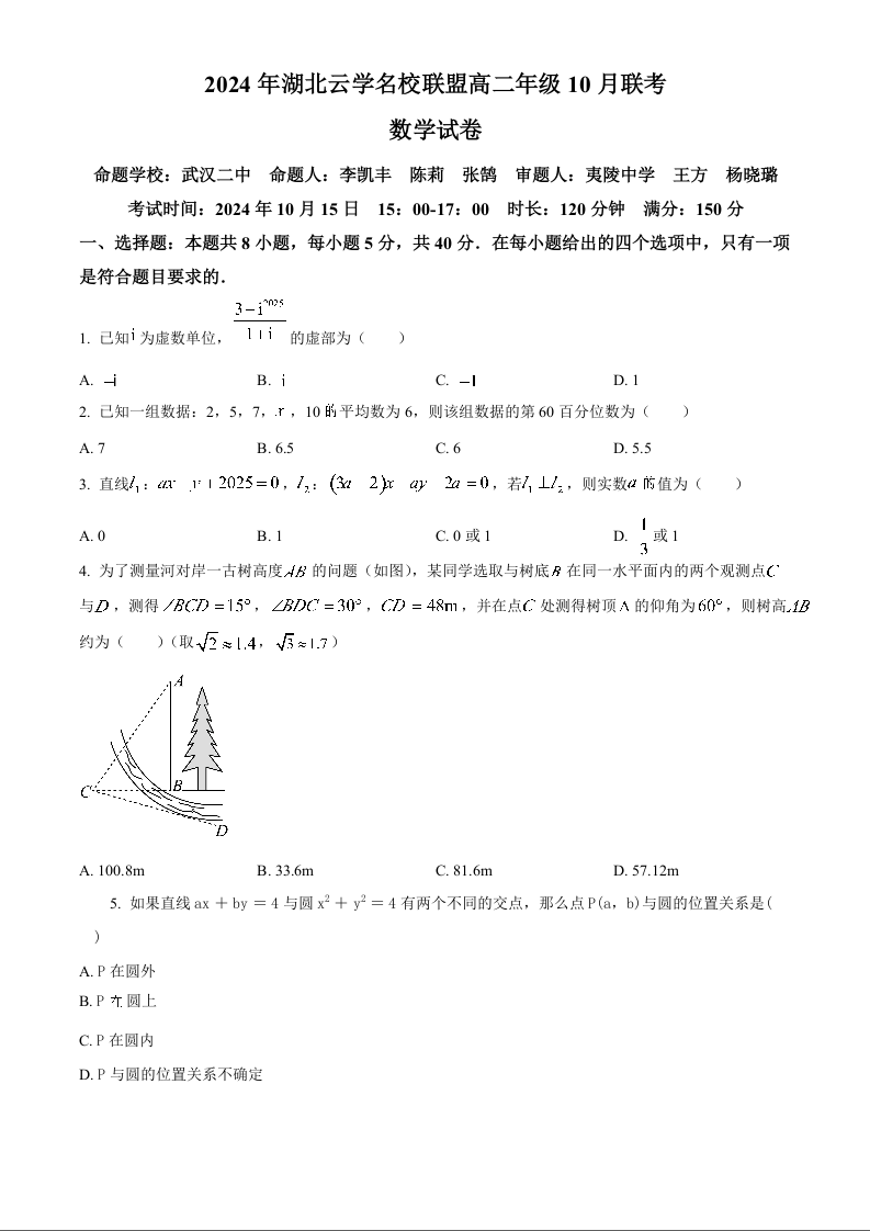 2024年湖北云学名校联盟高二年级10月联考 数学